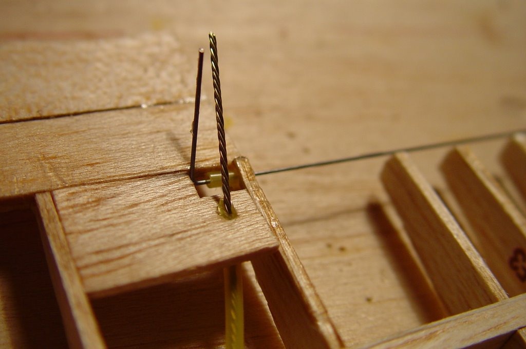 Topwing aileron actuators. The ailerons are glued to the metal rod, and pushing and pulling the end of the torque rod moves the aileron up and down.