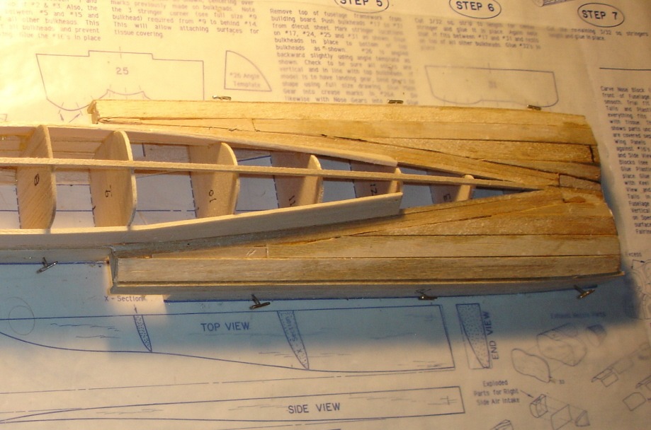 I am using a combo of 3/32 stringers and 3/32 X 3/8 planks to cover as suggested in plans. I also plan to use solid balsa sanded to shape for wings and tail feathers, also suggested by plans. We will see how it works.
