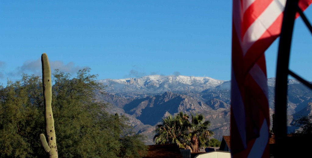 First snow on the mountains seen from the front door this morning.
