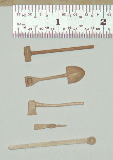 Every tank needs tools. There are carved from wood. The shovel from a popsicle stick. The mattocks is two pieces.