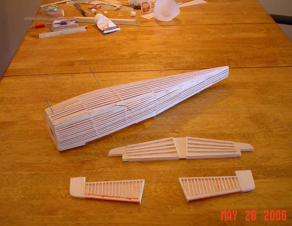 Stabilizer and elevators before sanding. Definitely NOT according to plans. Plans are the same as for the Ryan. This is supposed to be metal.