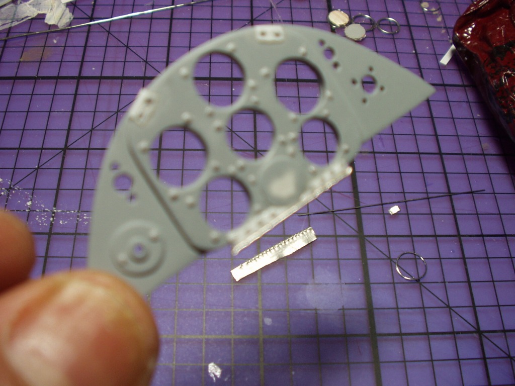 | plasticbuddha | 15-Aug-07 19:01 | | I noticed from the refernce photos that the faceplate of the instrument panel is hinged on the bottom and has catches on the top. I would imagine that this was to facilitate the replacement/servicing of flight instruments as needed. I tried to replicate the hinge by wrapping some wine bottle foil around a lenght of .010 dia. piano wire. I tightened the wrapping using an edge of my steel ruler and on a piece of glass. I then crimped the "separations" using a pair of flush cutters. Sorry about the blurred pics again (old autofocus digital) |