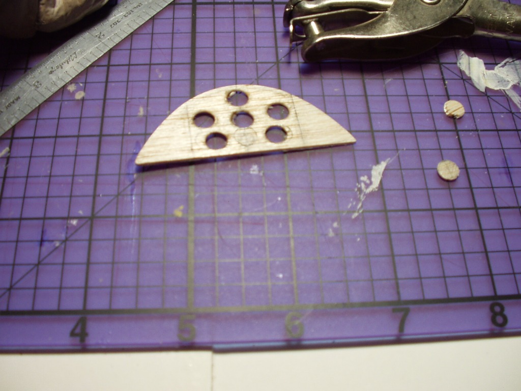 Started work on the instrument panel. After a bit of experimenting, I ended up using a paper puch directly on the 1/32 balsa (I miss having a Dremel MotoTool). Takes a certain touch so as to avoid chipping.