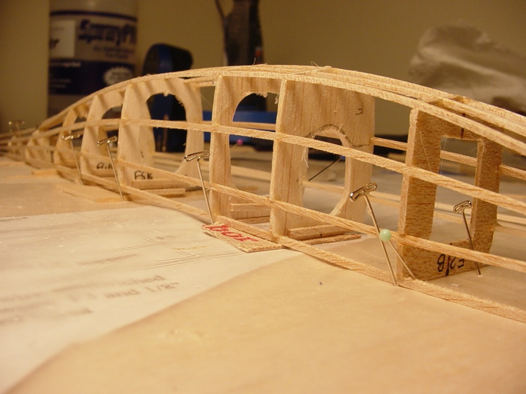 here's how I ended up assembling the fuselage. The formers are all square on top and I shimmed each one to match (as best I could) the curve lengthwise. It's still a liittle beyond my abilities right now, and although it came out straight the formers got skewed in plan view (from above). Drats.