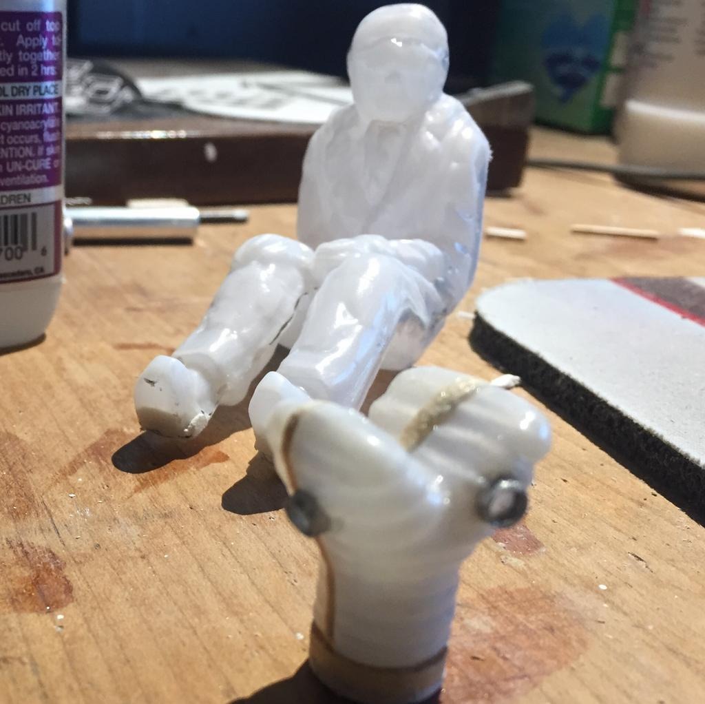 I alternated between fitting the rear half inside of the front half...down at the legs and again near the top of the body. Then liquid cement to melt the seam and putty to round the edges of it, with CYA adhesive overall along the entire seam to seal it.