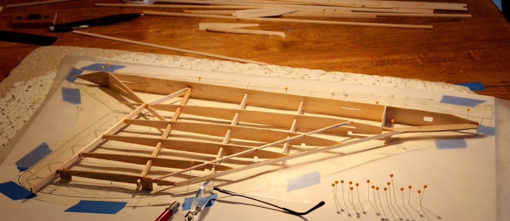The airfoil is the same top and bottom which allows both wing panels to be built on the same plan. The tabs on the end ribs will be removed.