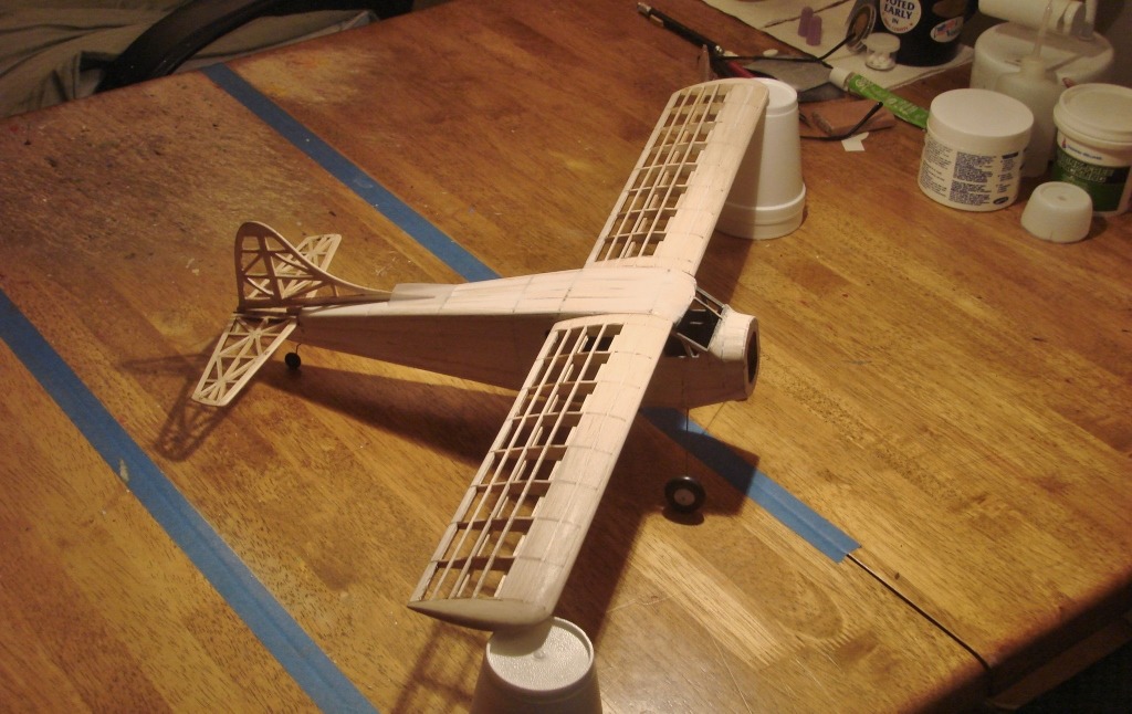The tail feathers and wings have had filler applied and sanded and have been given two coats of nitrate dope and sanded so they are ready for covering. The fuselage has one application of filler and will get another before doping for covering.