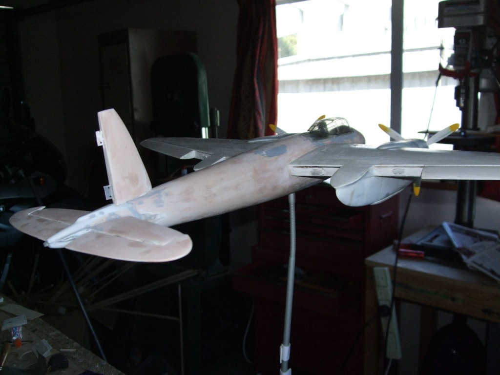 Wings and tail nearly all in place. Carved balsa extensions have been added to the engine/landing gear nacelles. Horizontal stabiliser is also hinged for movement