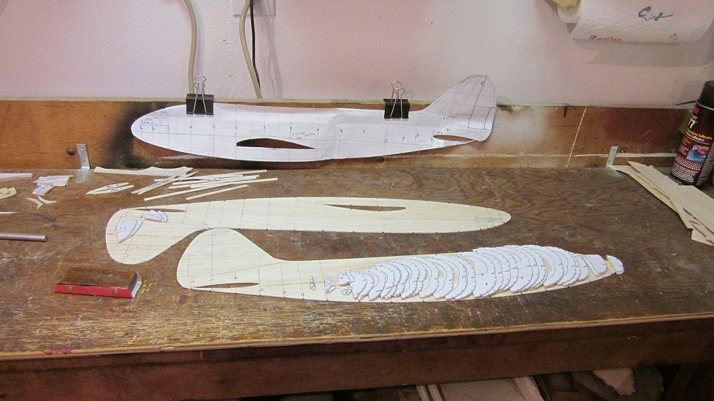 All parts cut. Ready to glue. DD, I decided to try the method you used on the Mossie. 3/32 works a lot better than 1/16. Especially those doggone flimsy stringers.