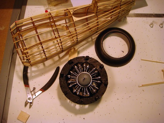 This model was designed for rubber band power. The cowl is modified to accept the radial. I spruced the radial up a tad.