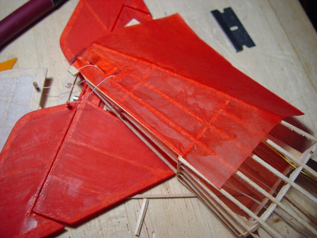Covering the fuselage underneath the tail plane. White glue was applied to the frame, then the tissue was layed on, and more white glue brushed over the tissue. It should dry nice and taught.