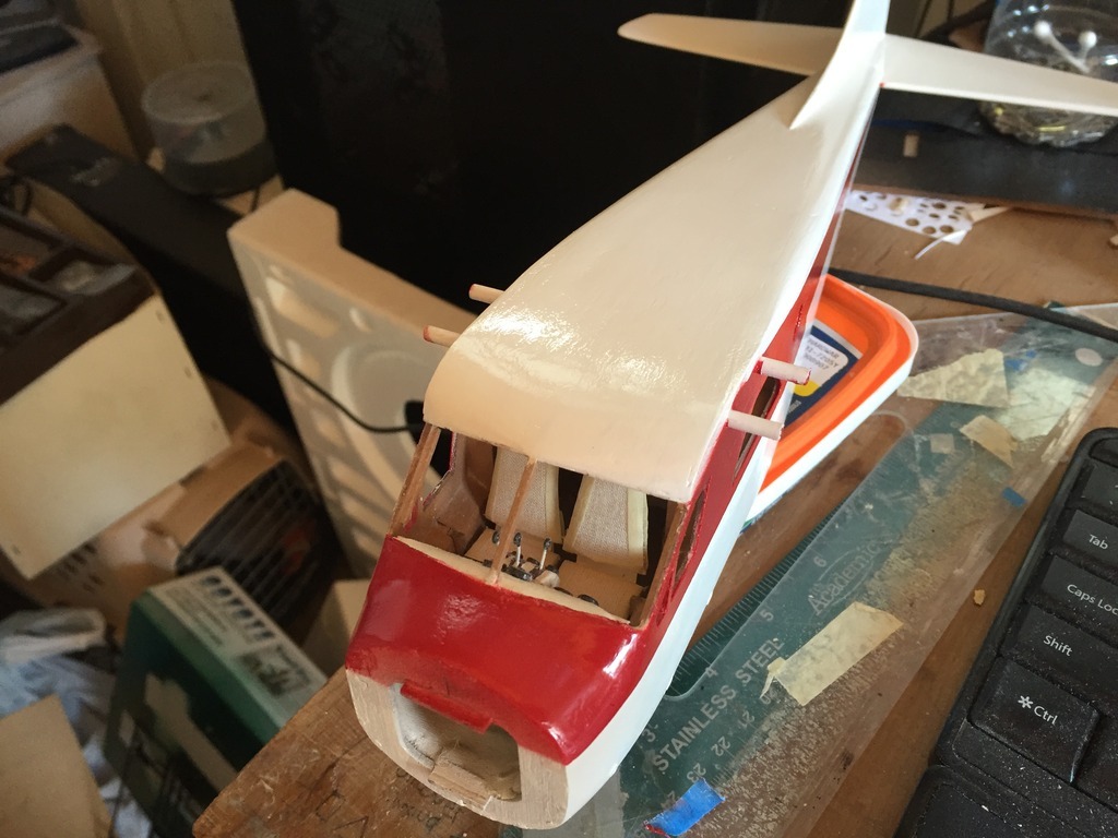 so here you get a sense of the interior and you can see that the cardstock has cleaned things up in there fairly well. The seats are bordered with plain masking tape, which seals the fabric edges, attaches the material to the balsa seat back and bottom panels..and can be prepainted in any color you like.