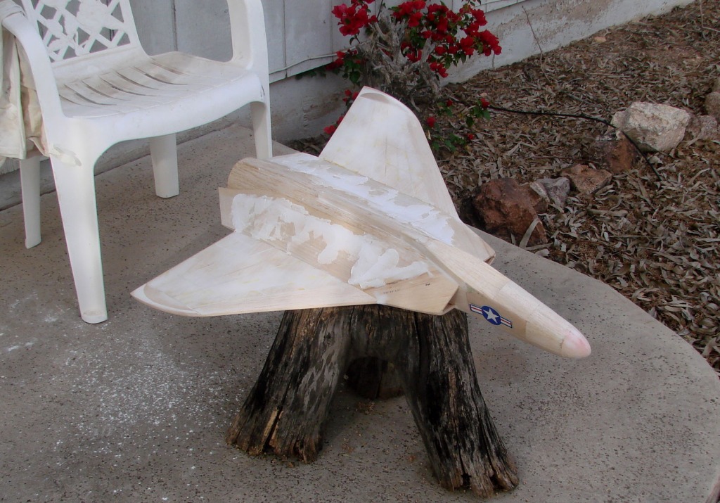 | David Duckett | 23-Jan-16 17:23 | | I thinned the filler and used a palette knife to apply it to the wings. It sanded smooth fairly easily so I did the same thing on the jet intake/fairing areas. This first application is to smooth all the sections together and the top and bottom sections will get it next. When all 3 sections are done the whole thing will get an application of filler. This will dry overnight until about 11 tomorrow morning when it should be warm enough to go outside. |