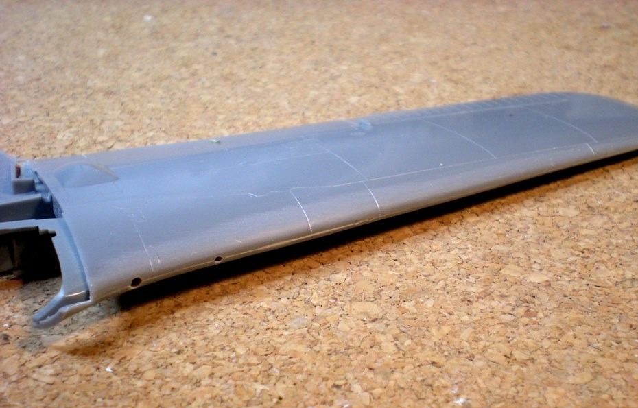 The top wing sections are fitted and glued with MicroWeld. Then a bit of putty is aplied to the seam.