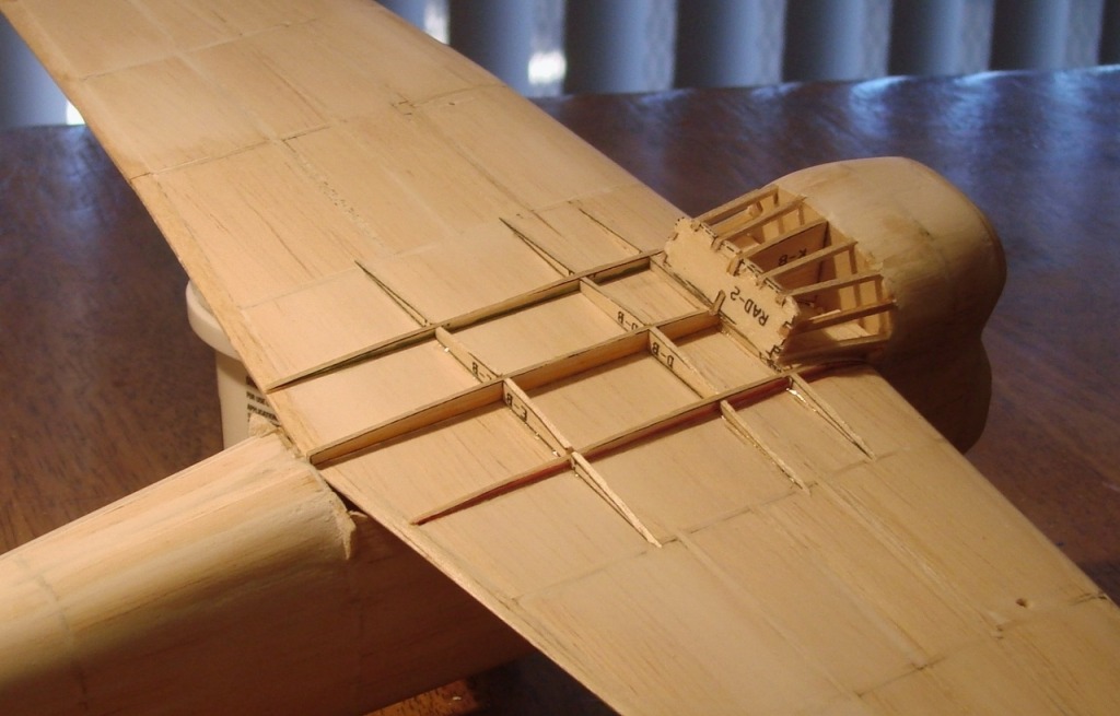 The radiator and belly pan. The colored pieces were cut from the wing ribs earlier and re-installed after the wing was infilled and sanded.