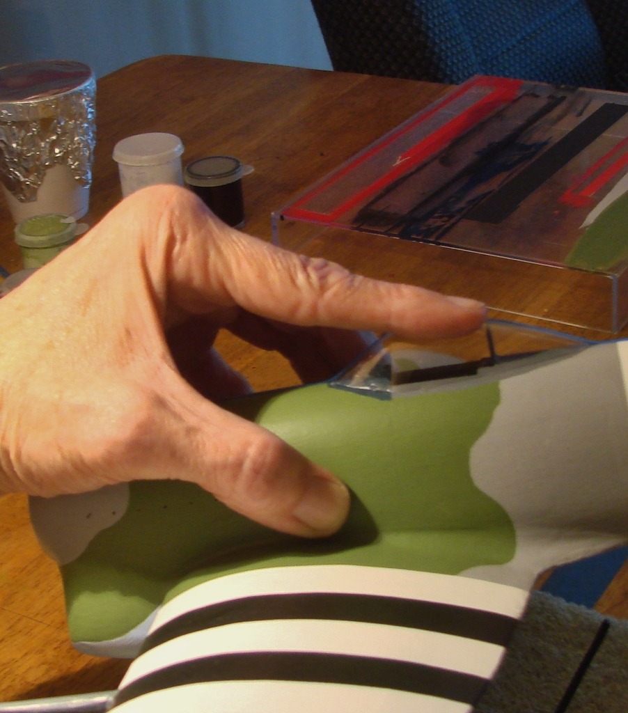 | David Duckett | 10-Apr-15 14:33 | | Gently pressing down on the canopy will force the sides into contact with the fuselage. Put a very small drop on each side, about where my finger is, to secure. Finally put a small drop at the rear. Once securely in place, I used the pin to apply VERY small amounts of CA around the eges to seal. I filled a couple of small gaps with white glue. |