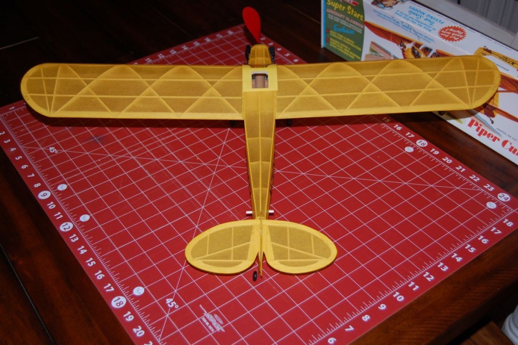 | scigs30, Image # 44803 | 18 May 25 23:18 |  Well, the in laws have left and I was able to finish the Comet Cub today. The only modifications to the kit was replacing the white tissue with yellow tissue and using black tissue for the black decals. By the way, adding tissue decals with dope thinner is the easiest way to trim out a model. I know there are many ways to make this a better model but this is nostalgia. I did print the Cub decal on paper and glued it to the rudder. Also, the Cub engines are the printed folded ones on the plans and I painted them with Testors enamel paint. Final weight as shown is 46 grams. Next is the trim flights. Not a perfect build but hey the kit is over 50 years old. |