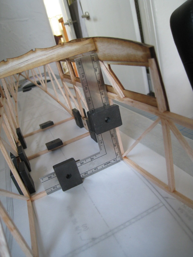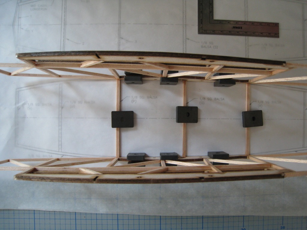 | jgood, Image # 17693 | 25 Apr 10 17:44 |  All was aligned perfectly, until having to bend the nose in to join the sides with F2. You need an awful lot of bending, on those already laminated sides. Unfortnately, mine did not bend in at exactly the same rate, and it's slightly off scew now. Also, the stress on that F2 is so great that it actually split the wood on the 1/8th sq balsa upright. It's a good idea to soak these in CA once it's in place to make them a bit stronger. |