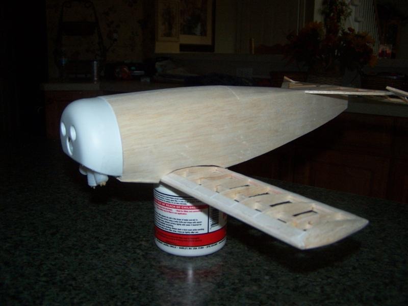 All new 1/16" formers and 3/32" stringers on fuse . Stabe is all recut 3/32" material. Will sand and use some 1/32" sheeting and silkspan. |