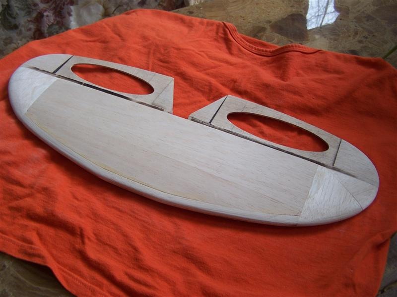Second wing section. Once the blue tape begins to show the wing former, using a finer grit now will bring the basswood spars and trailing edges flush w/o cutting binto the balsa. |